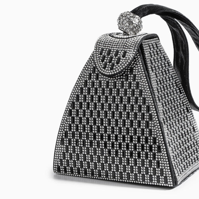 Crafted from premium cruelty-free leather, this handbag features a striking pyramid-inspired design and a sleek magnetic closure that blends fashion with functionality. The satin silk strap adds a refined touch, while the premium rhinestones lend an air of timeless elegance. Available in black, silver, or gold, the Olivia Handbag effortlessly complements any outfit. Choose sophistication and redefine everyday elegance with this exquisite accessory